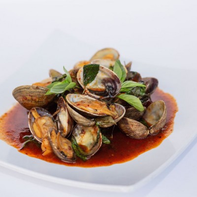 Fresh Manila clams with “prik pow” (roasted sweet chili paste) & basil